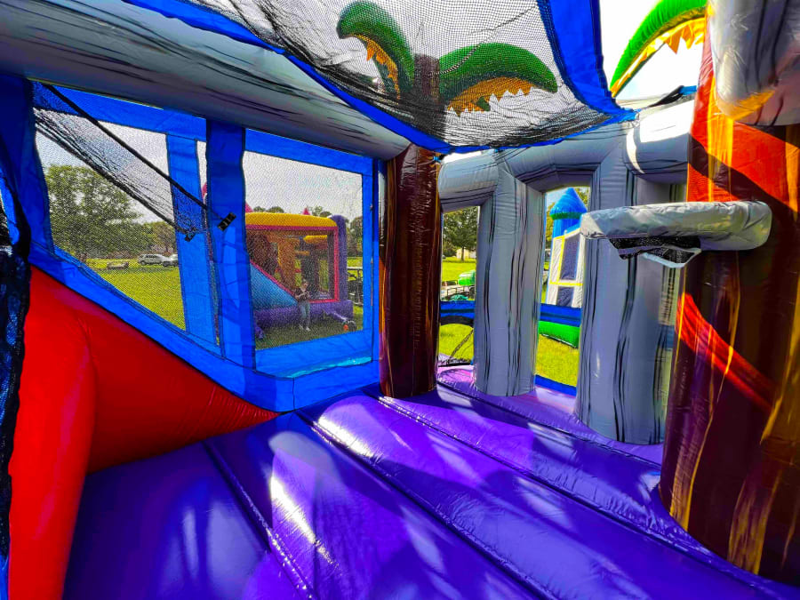 Unleash the Adventure: Inspired by lush tropical landscapes, this dry adventure is packed with fun while conserving space, making it ideal for both indoor and outdoor events. The spacious bounce area and interior slide invite children to bounce, slide, and explore to their hearts' content.