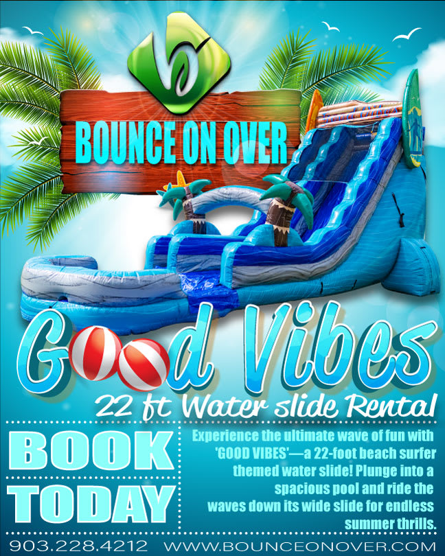 Bring the excitement of a beach paradise to your doorstep in Whitehouse, Tyler, Bullard, Flint, Chandler, Lindale, Troup, Kilgore, Arp, and Surround areas with our 'Good Vibes' water slide rental. Contact us at Bounce On Over to reserve your ticket to summer fun and make unforgettable memories with family and friends!